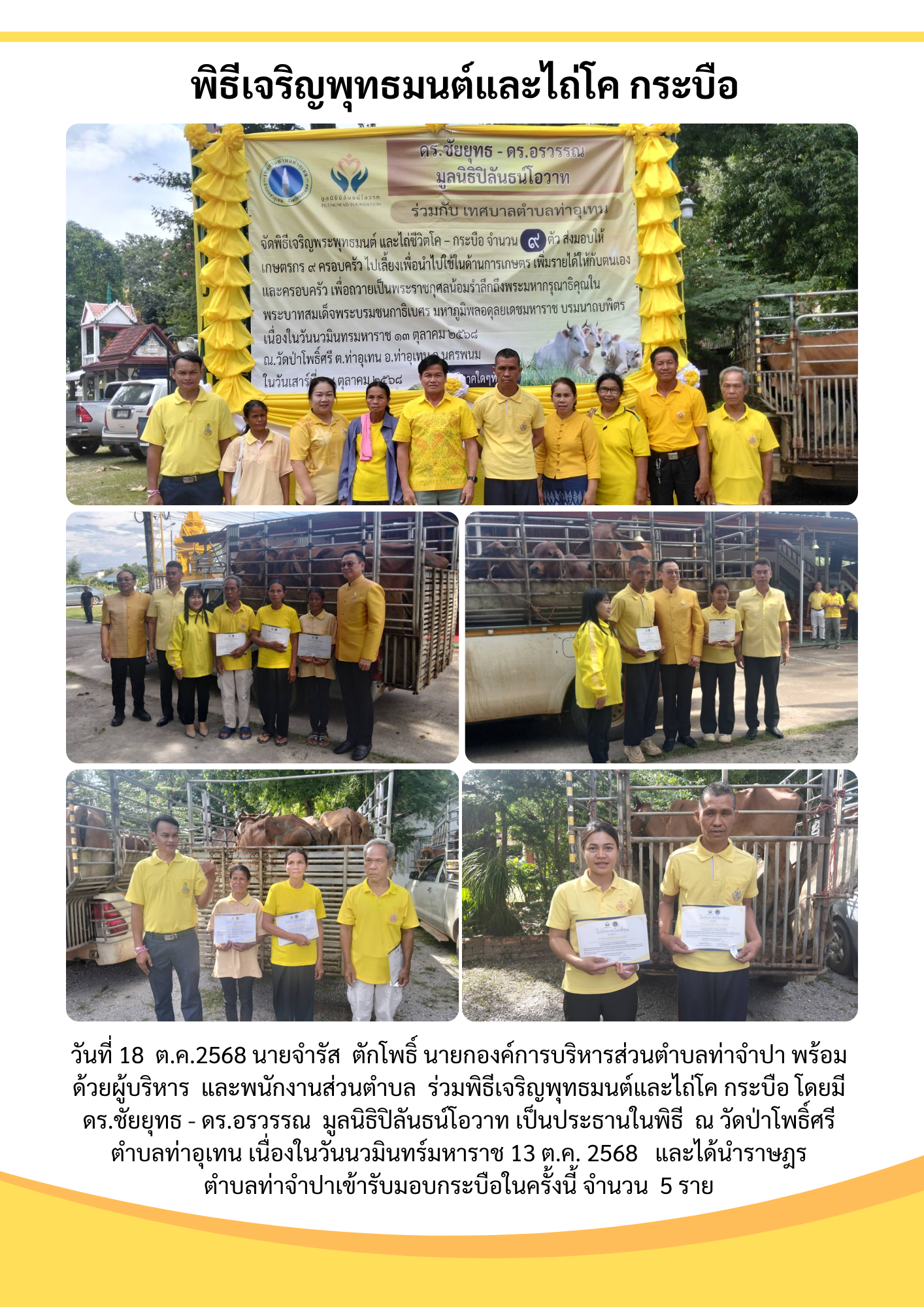 วันที่ 18 ต.ค.2568 นายจำรัส ตักโพธิ์ นายกองค์การบริหารส่วนตำบลท่าจำปา พร้อมด้วยผู้บริหาร และพนักงานส่วนตำบล ร่วมพิธีเจริญพุทธมนต์และไถ่โค กระบือ โดยมี ดร.ชัยยุทธ – ดร.อรวรรณ มูลนิธิปิลันธน์โอวาท เป็นประธานในพิธี ณ วัดป่าโพธิ์ศรี ตำบลท่าอุเทน เนื่องในวันนวมินทร์มหาราช 13 ต.ค. 2568 และได้นำราษฎรตำบลท่าจำปาเข้ารับมอบกระบือในครั้งนี้ จำนวน 5 ราย
